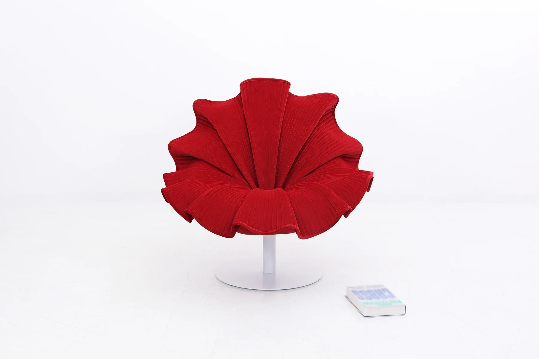 The design of this fabric swivel leisure chair is inspired by blooming flowers. Hundreds of fine stitches extend outward from the center of the seat, and the stacking of natural folds gives the chair a unique visual effect.