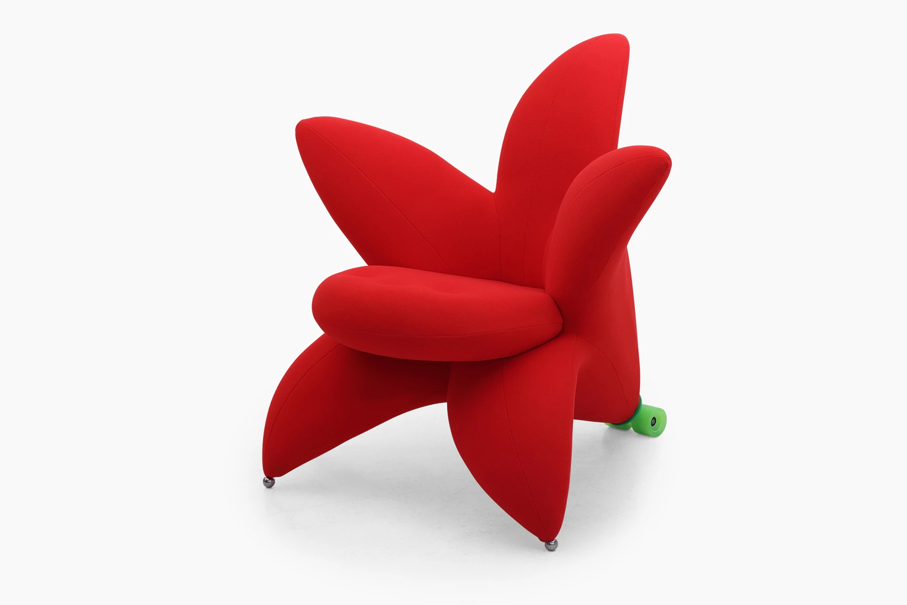 The Getsuen chair draws inspiration from the beauty of nature, taking the form of a blooming lily to bring the outdoors into interior spaces. Its petal-like structure, filled with comfortable polyurethane foam and covered in soft fabric, offers both visual delight and comfort seating experience. Supported by two sleek metal front legs and two small green wheels, this chair seamlessly blends aesthetic appeal with practicality.
