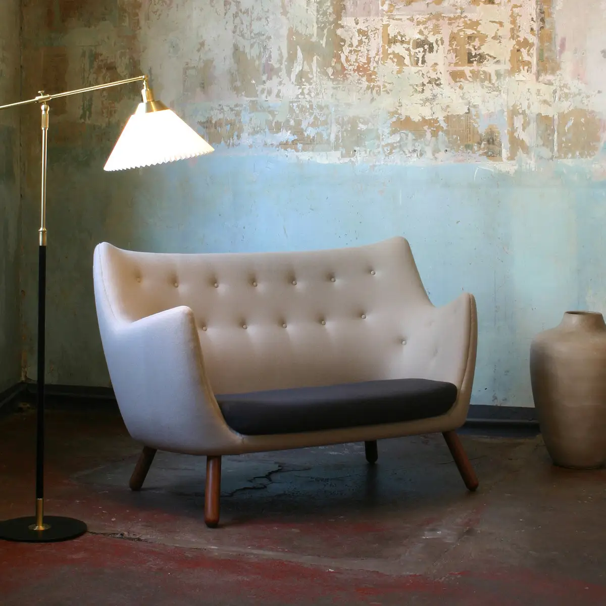 The small two-seater sofa was initially designed in 1941 as an experiment by Finn Uhl for his home. The Poet Sofa is crafted in the same manner as the Pelican chair, featuring hand-sewn buttons on the back of the seat and round, solid wood legs.